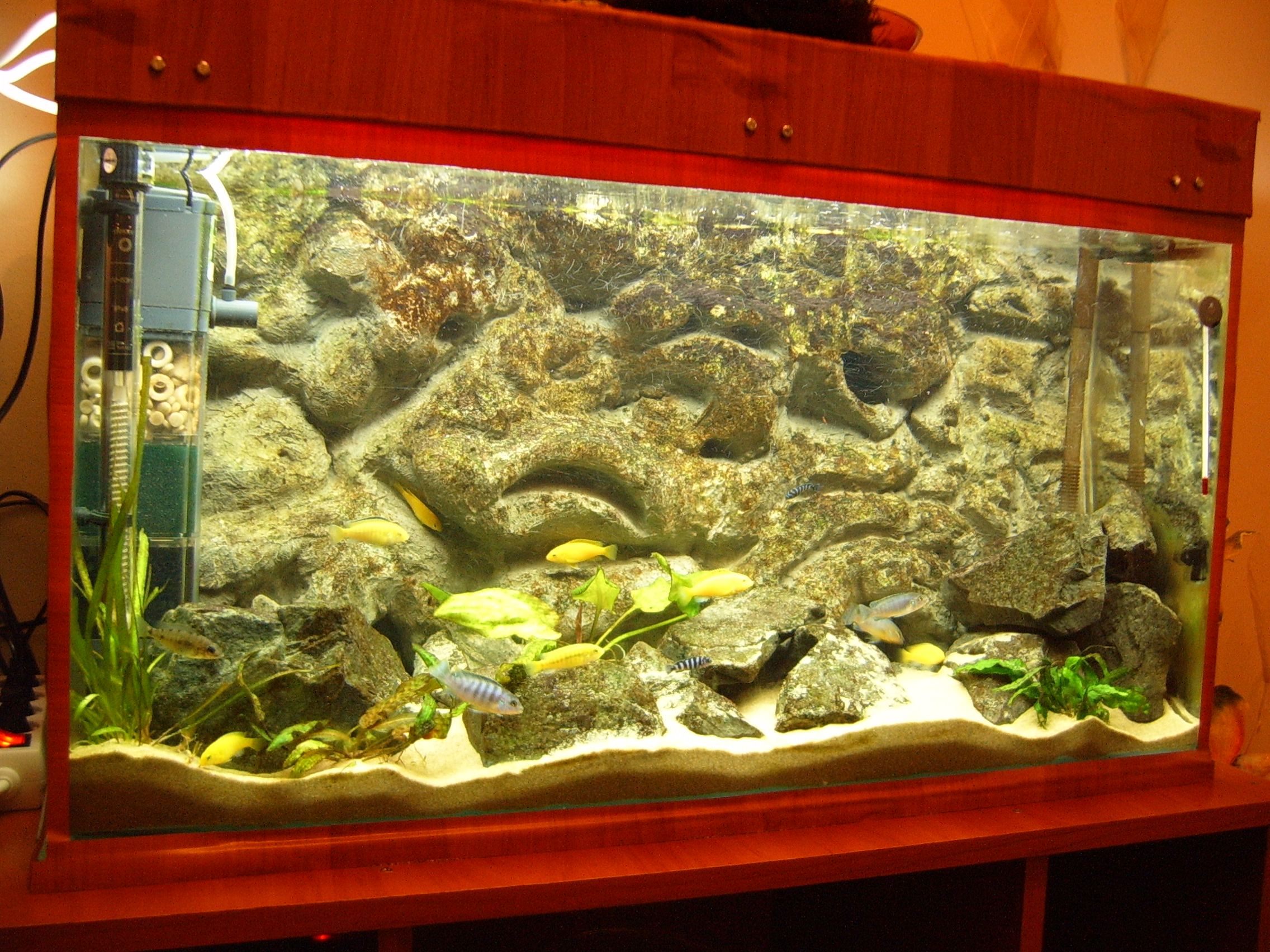 Знам, че в този форум повечето са почитатели на зеленкото и не харесват аквариуми от типа каменна кариера :) Прилично озеленен, за да не се загуби красотата на рибите. Ето така изглежда от близо месец: