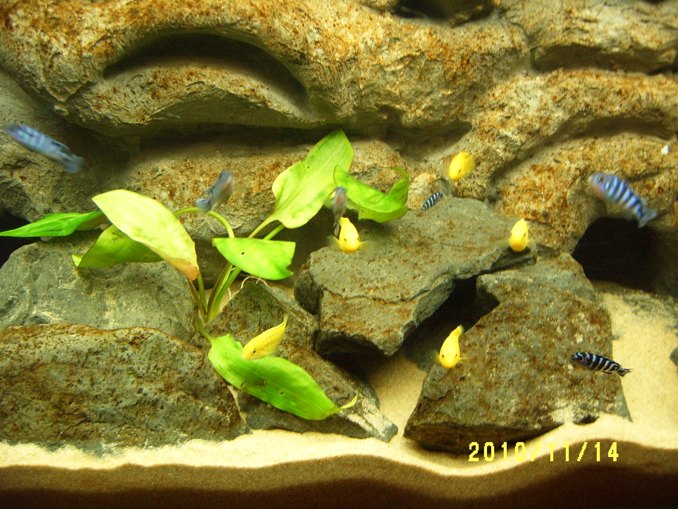 За укритията бъркаш, под двете купчини камъни лявата и дясната всичко е изровено и няма грам песъчинка, вижда се подложката :) Териториите са разпределени и за това няма и агресия. Половината камъни са зарити, тези риби не търпят много аранжировка, сами си преаранжират аквариума, затова и растенията са на такива места, на които не ровят.