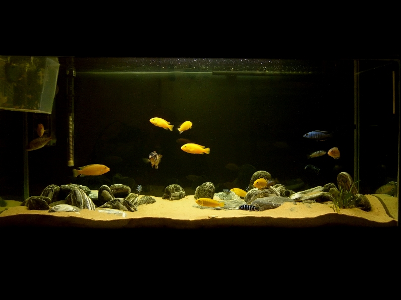 Знам, че в този форум повечето са почитатели на зеленкото и не харесват аквариуми от типа каменна кариера :) Прилично озеленен, за да не се загуби красотата на рибите. Ето така изглежда от близо месец: