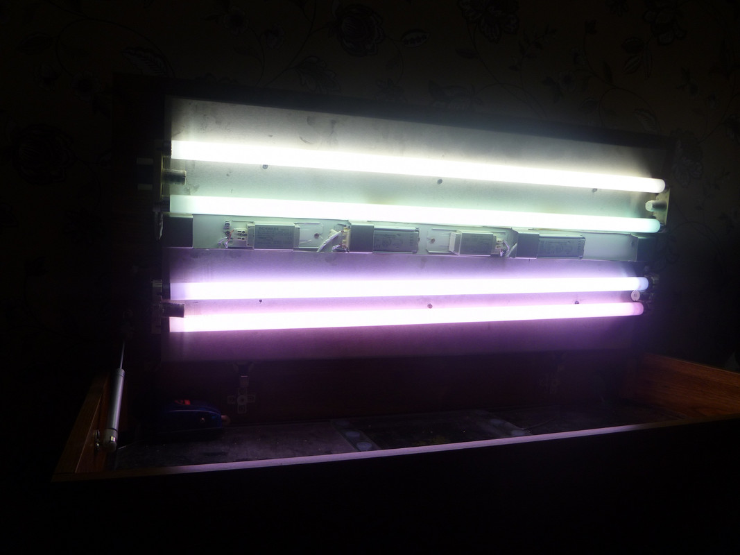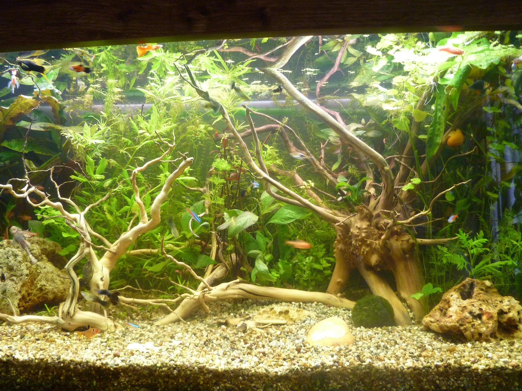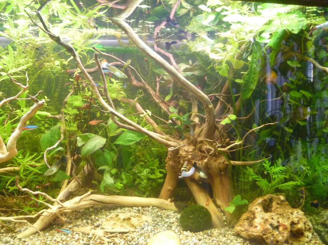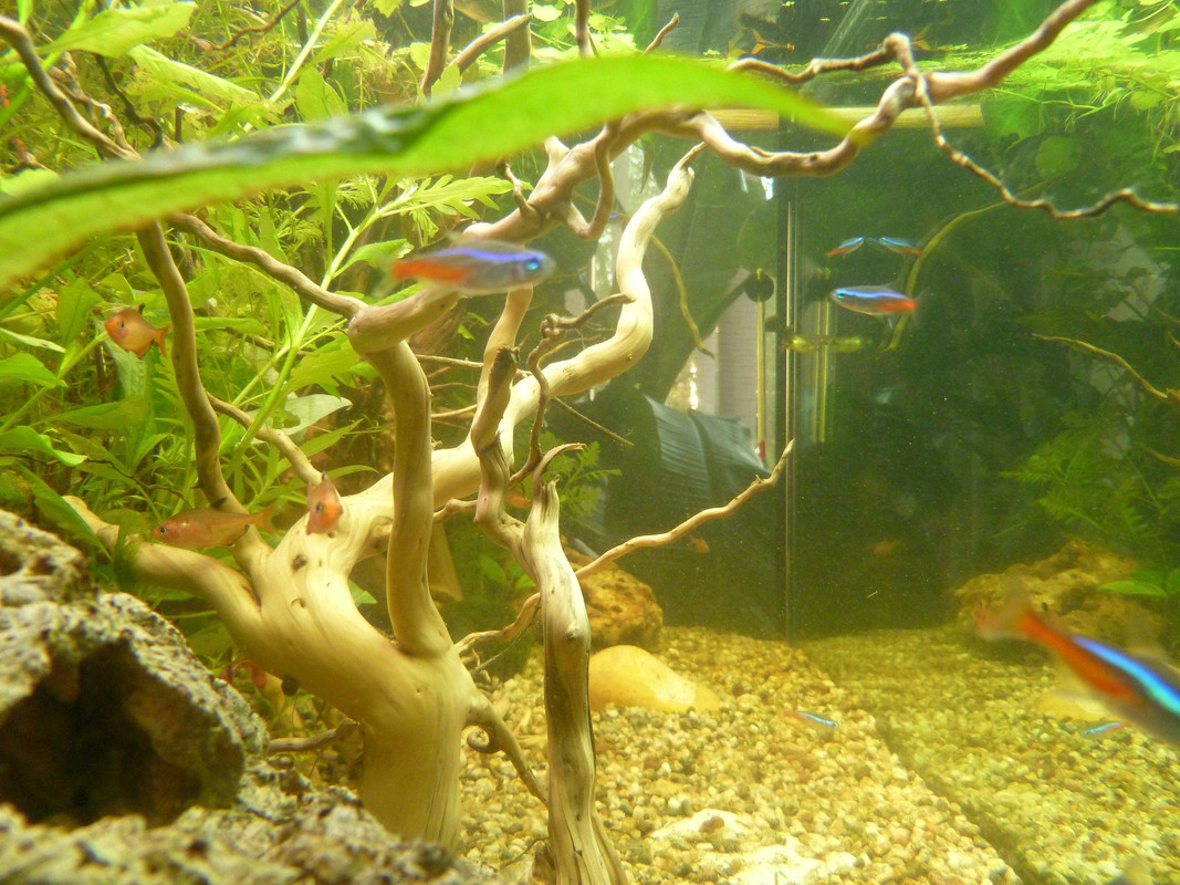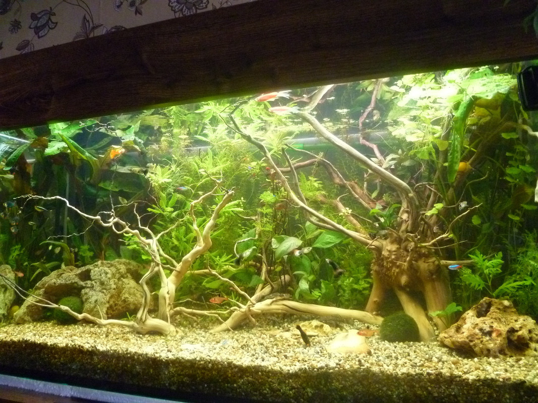 Здравейте колеги, първо-начинаещ съм, реших да ви покажа моя аквариум, направих конструкция, която облякох с ПДЧ плоскости , поръчах си аквариум от колега във форума, 100/45/50 - 225 л., долния акватерариум  ми е стар и е с костенурки, като той е върху плот с малки колелца, с незначителни усилия излиза целия навън за обслужване при нужда. Реших някакси да съчетая нещата и да спестя малко място във вкъщи и мисля, че намерих добър вариант. Аквариума оборудвах с външен филтър атман 3336 и за сега с 90 ватово осветление, скоро ще е 120 ватово, СО2 ми е с мая и захар (поради финансови причини), което добавих на третата седмица, на дъното има 2 см лава и след това грунд 5 мм (отпред около 6 см отзад около 8см) , корените сами с жена ми ги намерихме, изчистихме и сварихме, като растения имам над 10 вида, за съжаление не зная имената на повечето :) , ще се науча :) , рибки имам 11 неона, 4 данио, 3 сомчета, 2 гупи, 9 тъмни барбуса и скаридки чери, за нов аквариум мисля, че е добре :)
