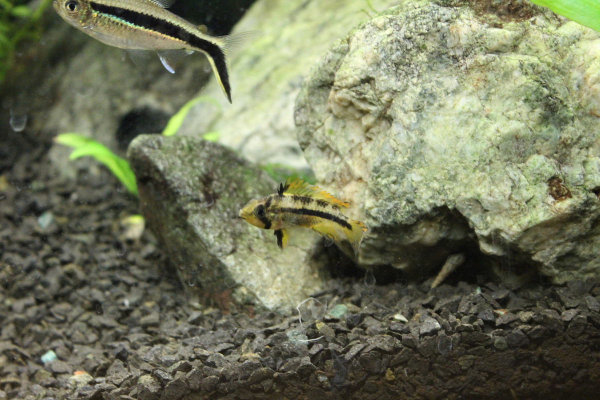 А това е другият ми аквариум стартирани са по едно и също време,а скоро го пренаредих малко.Осветлението е същото като при другия, филтъра е китайски 650l/h. Добавям профито на няколко дни по 1 2 мл.Обитателите са 13 клиновидни разбори ,2 апистограми какаду 5 анциструса и една хокейка.