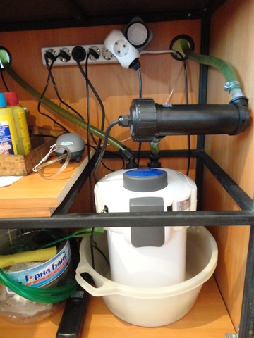 Преди три месеца добавих УВ Лампа на SunSun CUV-107 (7W). - Целта ми беше да избистря водата и най-вече борба с някакви много упорити тъмно зелени водорасли който се залепят точно по листата на растенията по стъклата по грунда изобщо навсякъде. Водата се избистри обаче проблема с водораслите остана, както се досещате те също много тормозят растенията.
