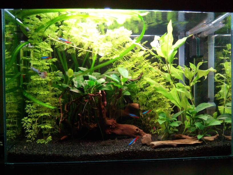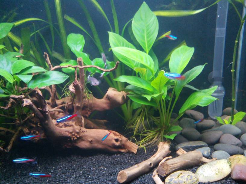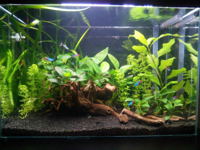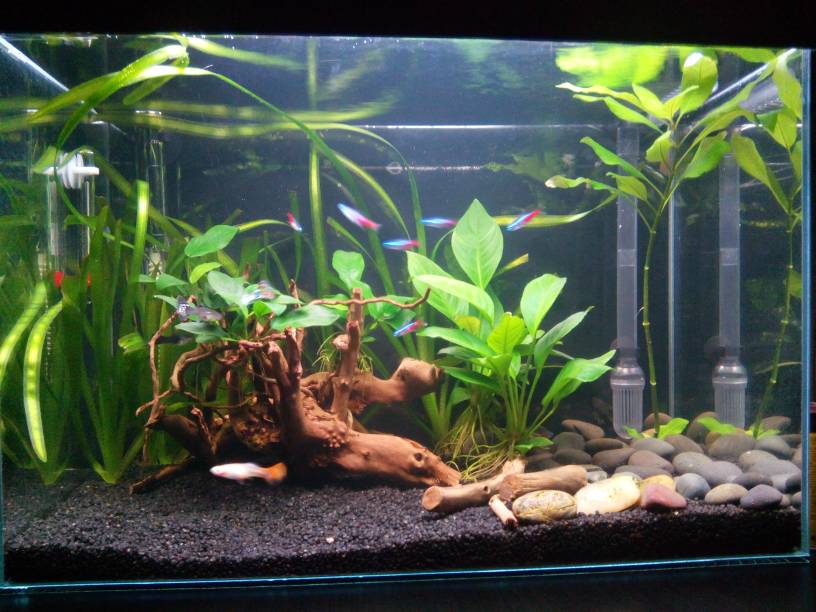 Добре си се справил.Камъчетата може да ги наредиш около корена .Анубиасите може да ги привържеш също към корена или към камъчета,ноне ги заравяй в грунда.Рибките за този обем са ти достатъчни не слагай повече.С торовете дийствай внимателно защото и осветлението ти е слабо,а и растенията не са ти претенциозни и не се нуждаят от много торене,рибките торят достатъчно. *DRINK*