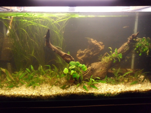 Добре......благодаря на всички! Този аквариум е бил под много форми и още не мога да го направя  :-[ Корена постоянно седеше в средата, затова го изместих, защото ми писна. Мисля да го изместя още в страни и да го обърна, да вдигна нивото, камъчета ще трябва да намеря и сложа, анубиаса ще е долу (плаче си за нов корен, този не ми харесва)