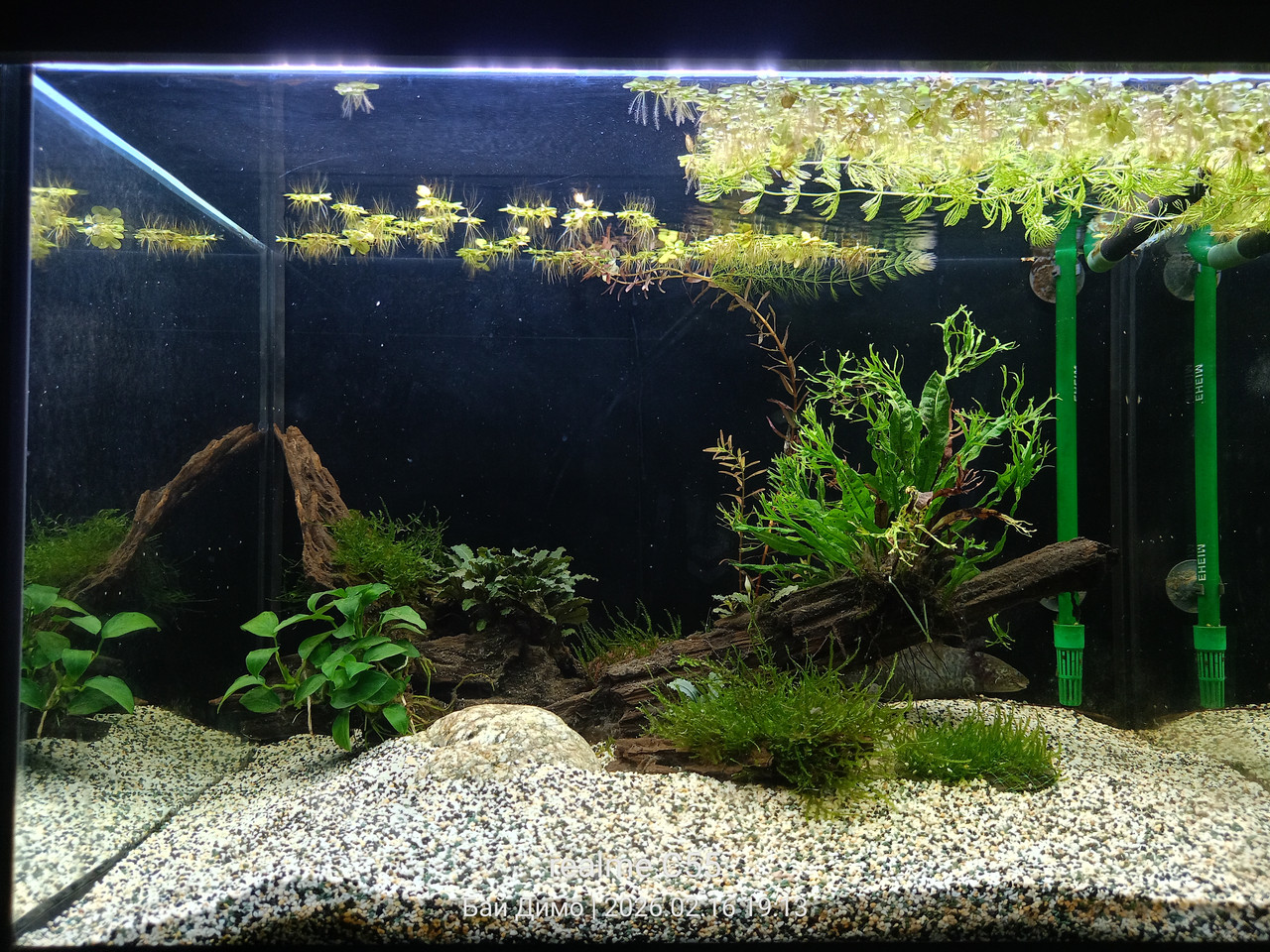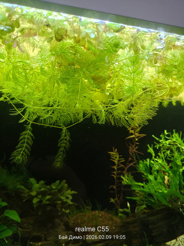 Да пусна малко развитие и от мен. Не съм писал отдавна, но за в бъдеще се се опитам да съм по-редовен . Не е кои знае какво мъховете тръгнаха горе долу, яванския добре а коледния който добавих не расте на елхички а по-рядък на пръчки.Незнам студено ли му е или просто му трябва въглерод. Добавих и малко роголистник също върви прилично.Отмина фазата на кафявите водорасли или поне се поуспокоиха . Снабдих половината град със Салвиния  :-D  при мен се развива доста бурно. Буцефаландрата е в застои нито се развива нито мре.Нямам опит с това растение от време на време пуска някои цвят и окапват. Листа и коренища имам чувството, че едно листо не е извадила. Микозоума взе да се предава, появяват се кафеви петна по листата и постепенно изсъхват и окапват. Отдавам го на температурата може би иска топло или ....незнам някой ако има опит нека пише. Не вярвам да е липса на нещо . И все пак се получава за сега аквариум с акселотъл и растения на 18градуса.Това е за сега малко но от сърце ❤️. Поздрави! https://i.postimg.cc/rp4YPMdc/IMG20260216191306.jpg  https://i.postimg.cc/hPhsYc6S/IMG20260216191327.jpghttps://i.postimg.cc/W1CH8h42/IMG20260216191318.jpg  https://i.postimg.cc/mZqcj4G6/IMG20260209190507.jpg. https://i.postimg.cc/9XS4b2jn/IMG20260209190525.jpg