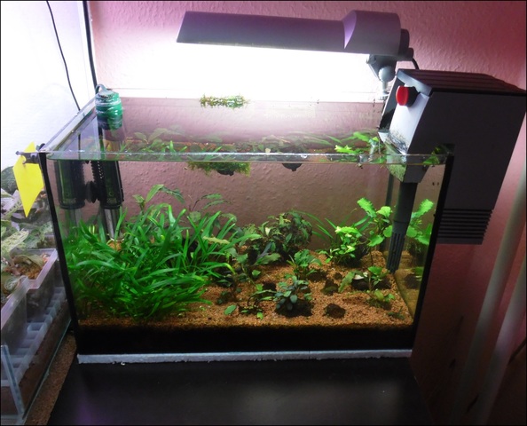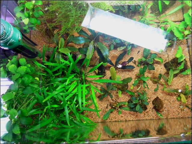 Началната фаза минава без проблеми, няма никакви драми, правя само частични смени на вода. Няколко от новите ризоми пристигнаха с брада и затова слагам EasyCarbo. Държа течението в аквариума сравнително силно, температурата първите две седмици беше 23С, сега я покачих малко. Светоденят е 6 часa.