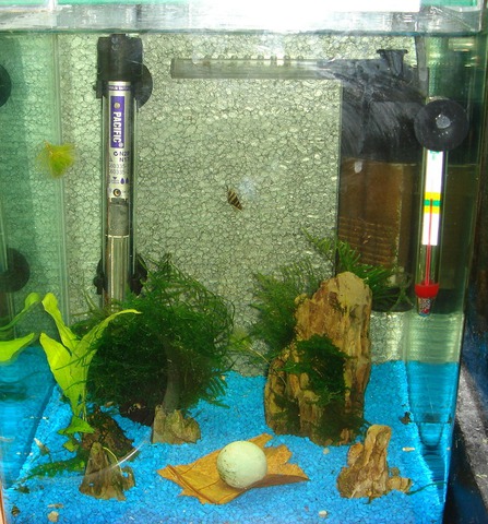 Малките новобранци се оказаха Черита и бяха старателно преместени по други аквариуми. Днес забелязах вече малки жълтури които едва се различаваха. Преди седмица забелязах една от женските с хайвер. Вероятно е била от по-рано но  ми е убягнала от погледа покрай други ангажименти. В числорто на пристващите е и синята скарида която  макар и единична се движи свободно всред другите и за моя радост показва добри признаци на здраве.