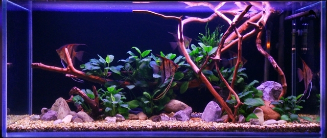 И в този ли ще се гледат скаларии?Корените и камъните са много хубави и добре си ги подредил.Ако беше мой големия щях да сложа още анубиаси между камъните,а може би и малко мъх по някои от тях.Иначе и така ми харесва много,а и като поранат микрозорумите ще е екстра  *DRINK*