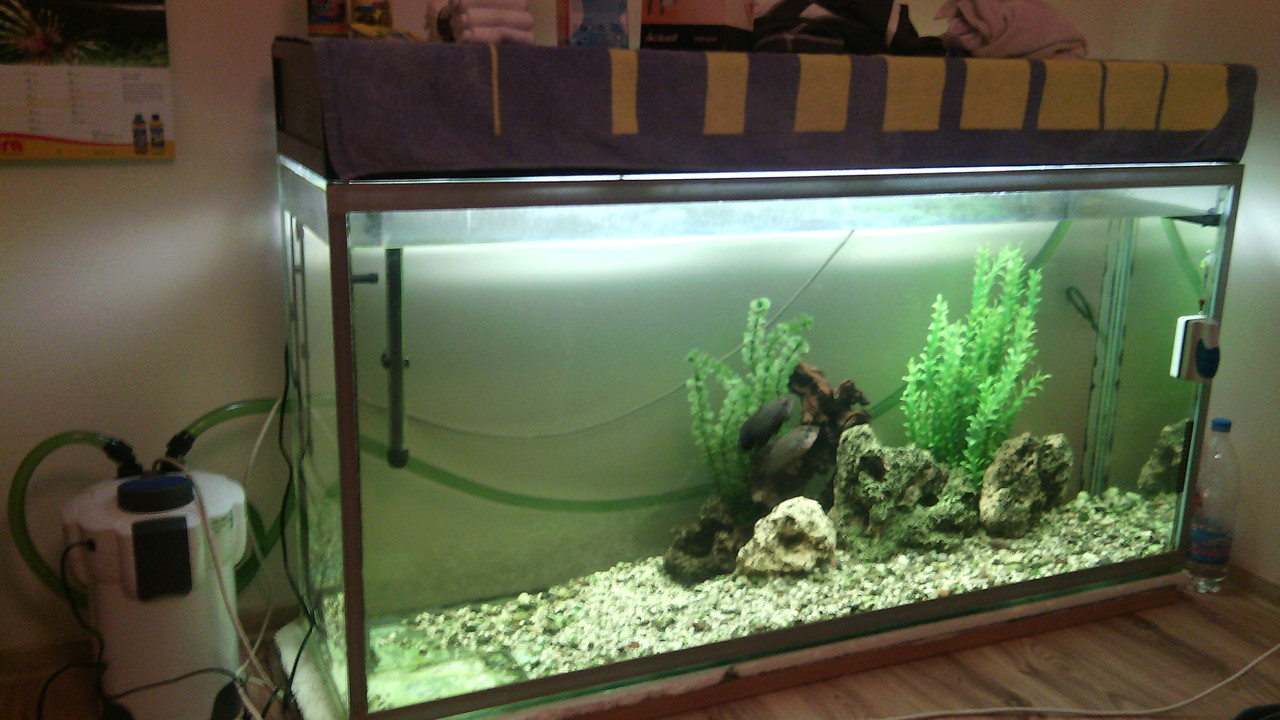 Благодаря за съвета да знам че ми е малак но нямах просто повечко пари ето още снимки. Утре пристига новата помпа за въздух. *YAHOO* и започвам да събирам пари за вътрешна помпа снимал съм ви разположението на нагревателя и другите неща когато взема такава помпа къде е редно да се постави за да има ефект рибите ги храня от ляво защото ми е по лесно и от там дърпа помпата.И ако може да ми кажете по колко да ги храня на ден тези сладури защото имат огромен апетит  *thanks