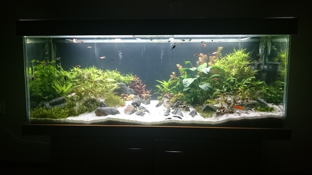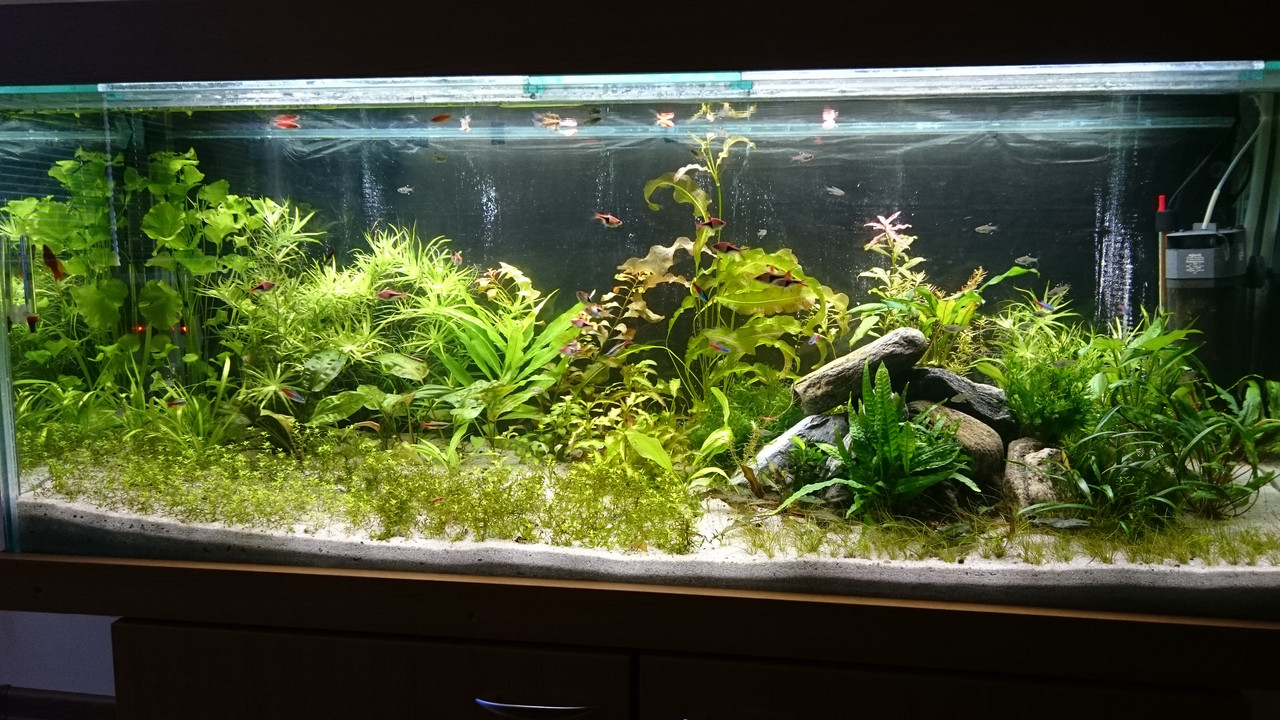 Размери 140х50х45. Осветление 4х36в 2 аквастар 2 филипс 840 и 865к. Филтрация Тетратек ЕХ1200,Ехеим 2226 и един вътрешен акваел. Грунда е кварцов пясък,лава и няква подложка за подхранване на корените. Аквариума е стартиран преди една седмица, 150л. вода е от старя ми акварум и още толкова престояла. Филтрите ги ползвах във старя ми аквариум не съм ги чистил да се запазят бактериите. Ми това е остава да чакам да се развие.