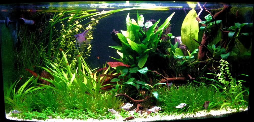 Ехинодураса, който се показва лека - полека трябва да стане по - голям с времето и за сега там мисля, че му е мястото. Зад корена централно има валиснерия, която и тя трябва да порасне и да образува зеления "фон". елеохариса също трябва да се издължи и да обхване по - голяма част на заден план, но си трябва време. През вечер съм с двете ръце вътре и размествам и все още не ми харесва окончателно. Така, че приемам всякакви съвети. Благодаря за сомчетата. И аз съм им голям фен.