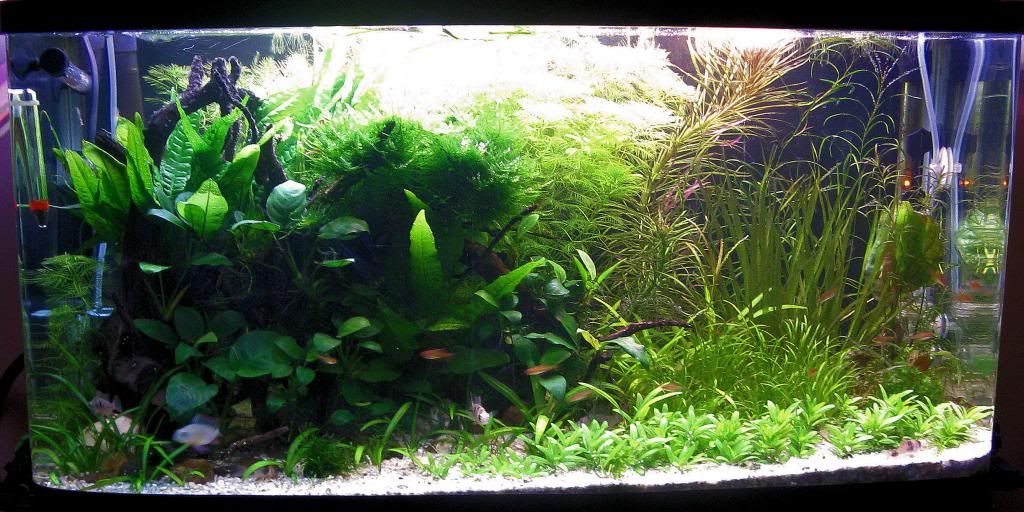 Аквариума е на два месеца. Очаквам да дръпнат растенията за напред, но определено няма да им се впрягам много. Тези не са капризни и освен валиснерията и криптокорина не изискват нищо особенно. Сега светя с 3 пури по 24W Т5 и 16 светодиода 1W(10 бели, 3 сини и 3 червени) преди бяха 5 по 24W T5  и си мисля дали да не махна още една пура да не си докарам водорасли. Торове добавям по - малко EasyCarbo само.