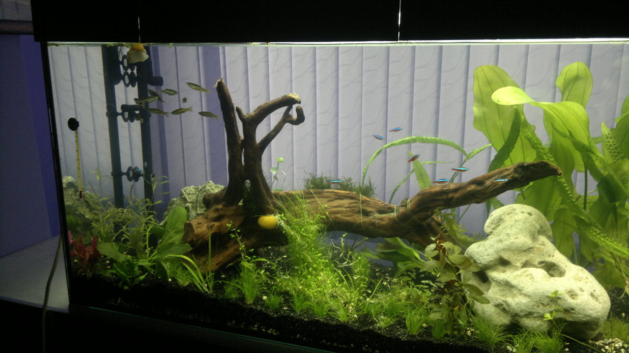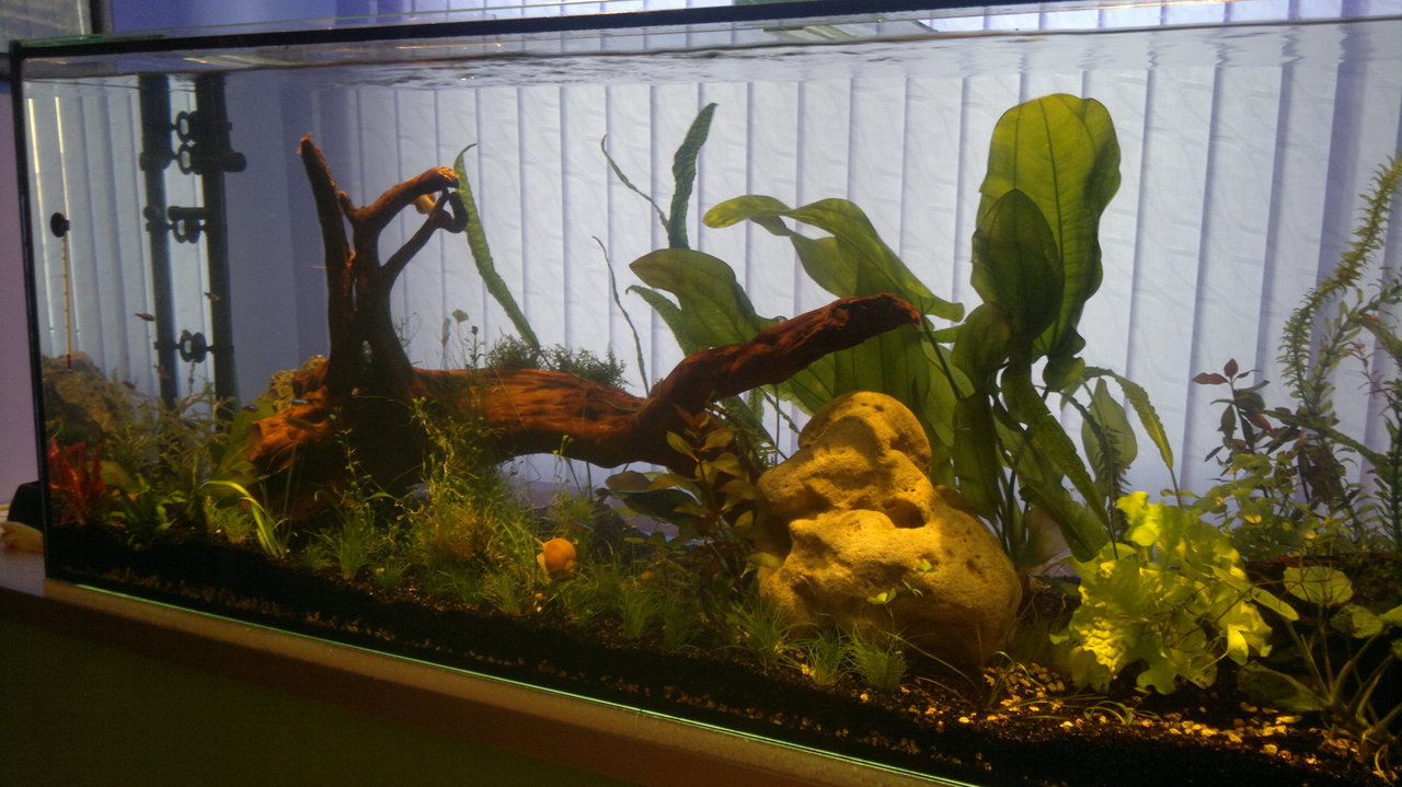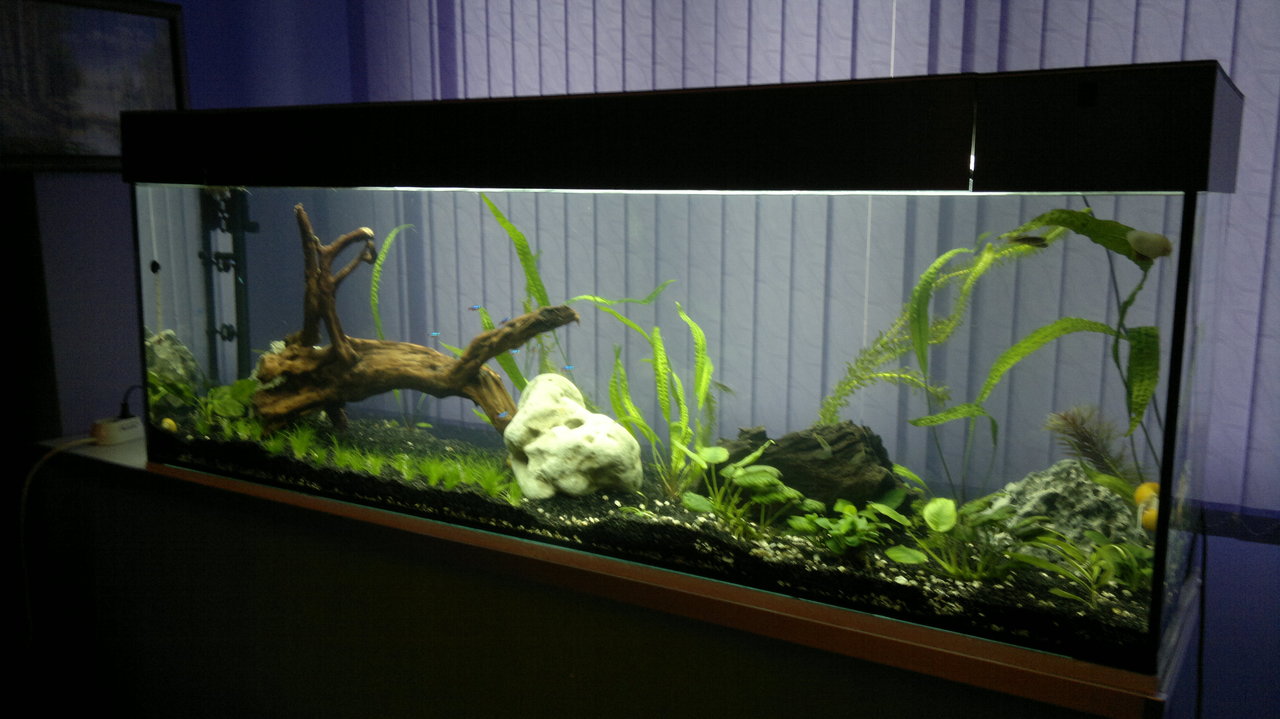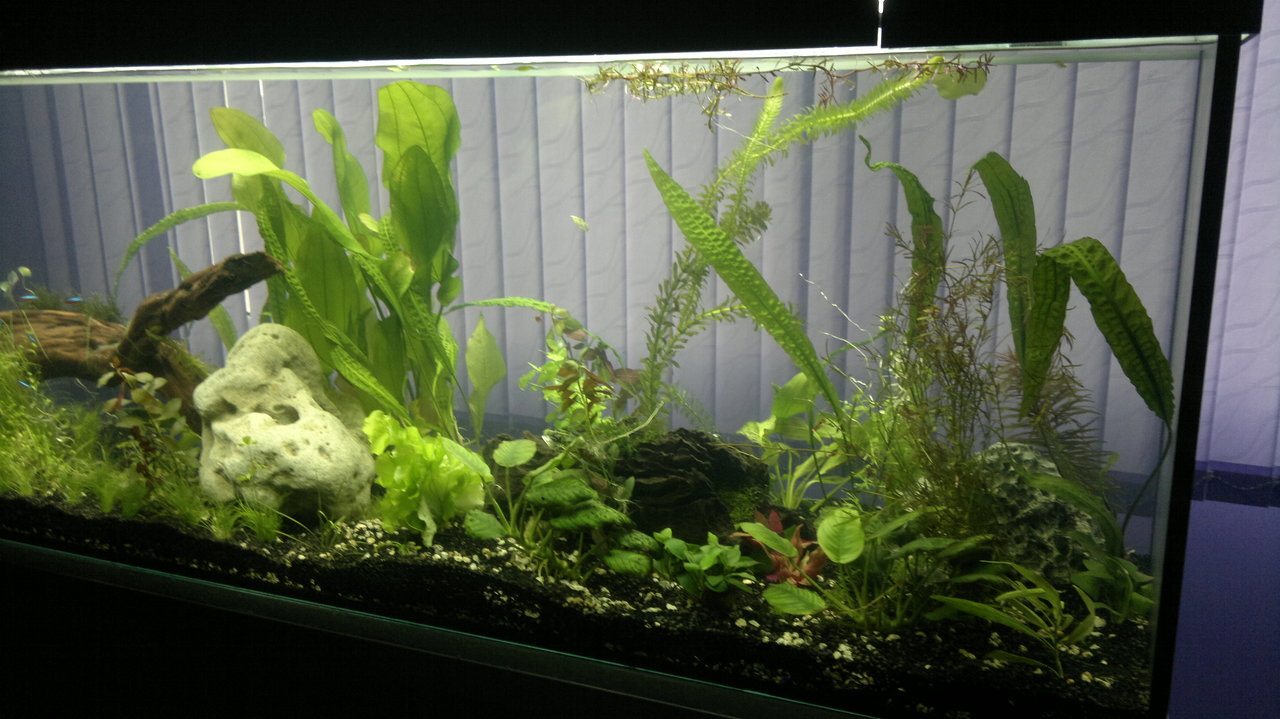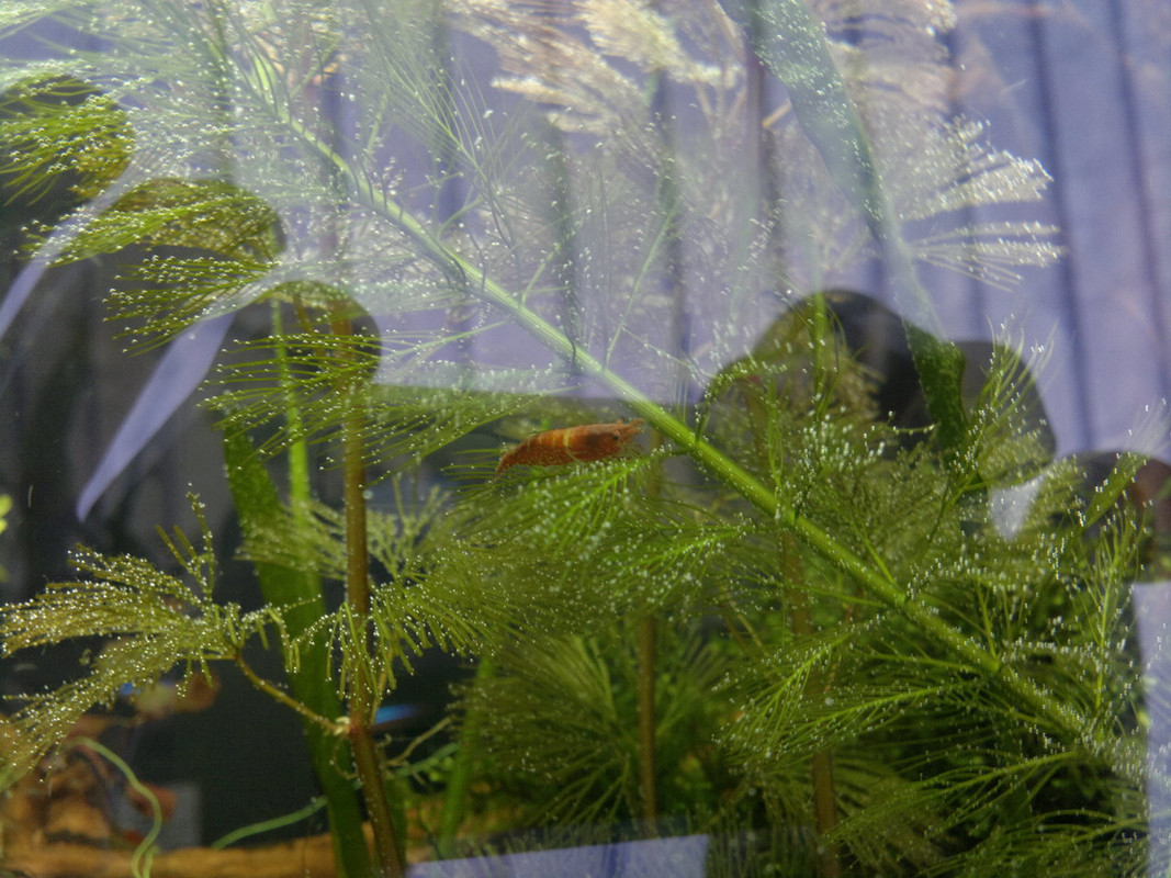 Обитатели: 10 данио-та, 10 сини неонки, цяла банда скариди (red cherry) и 6 охлюва Ампулария.