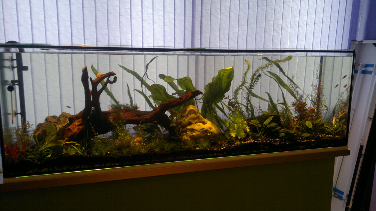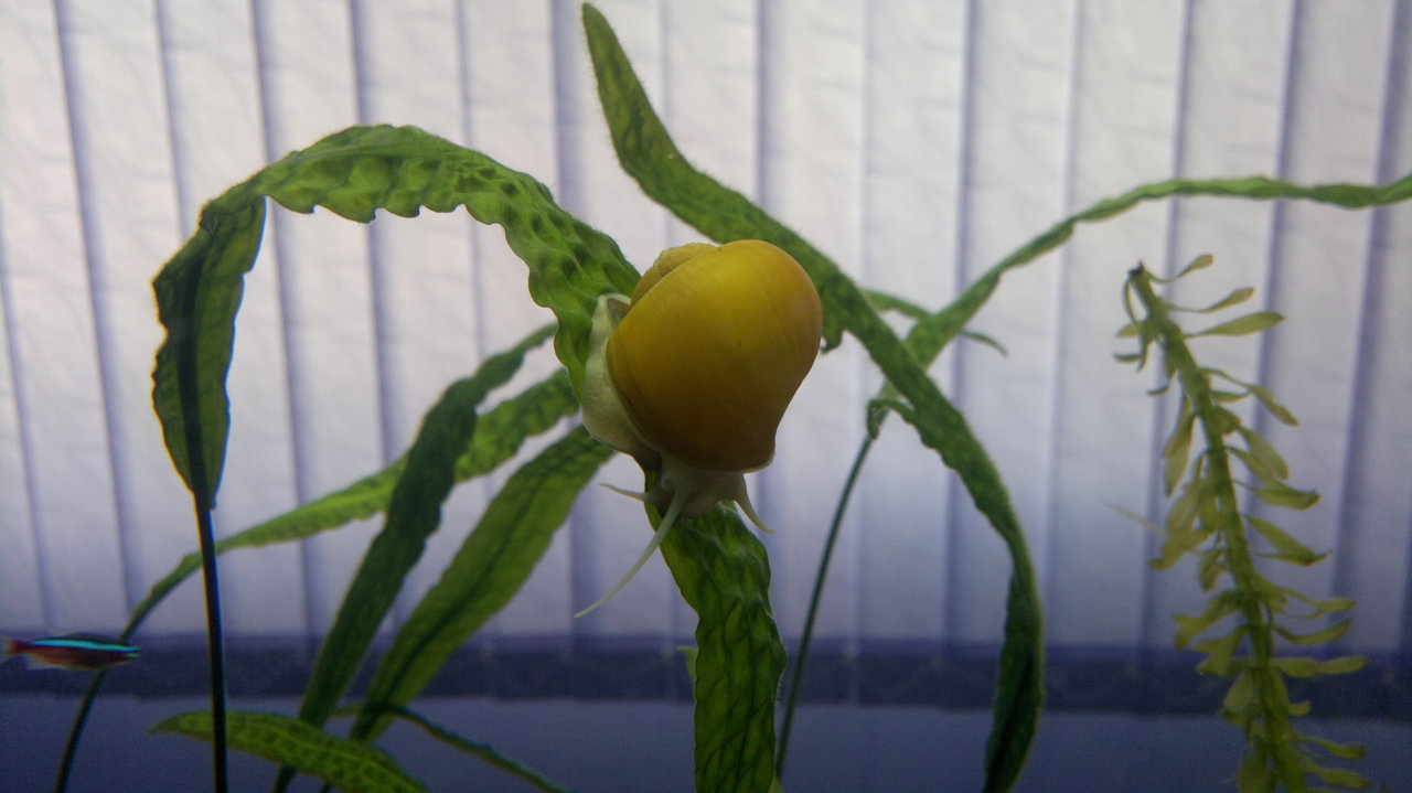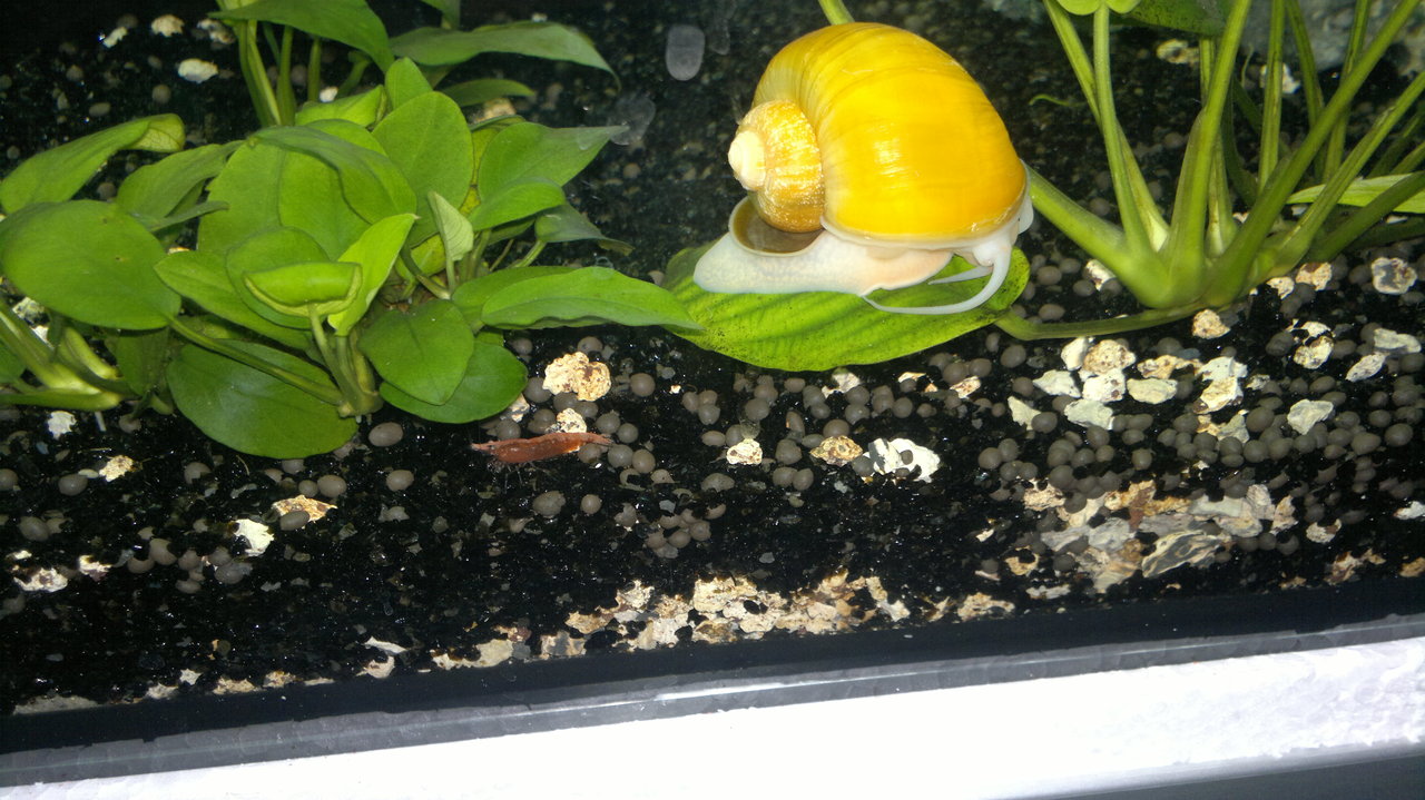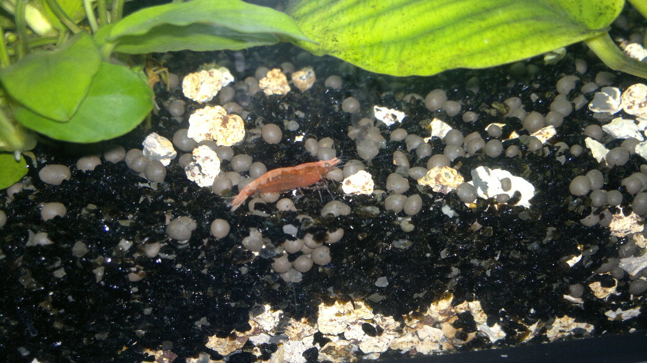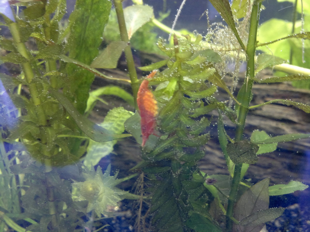 Обитатели: 10 данио-та, 10 сини неонки, цяла банда скариди (red cherry) и 6 охлюва Ампулария.