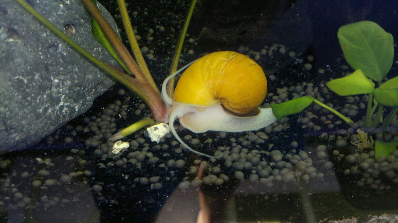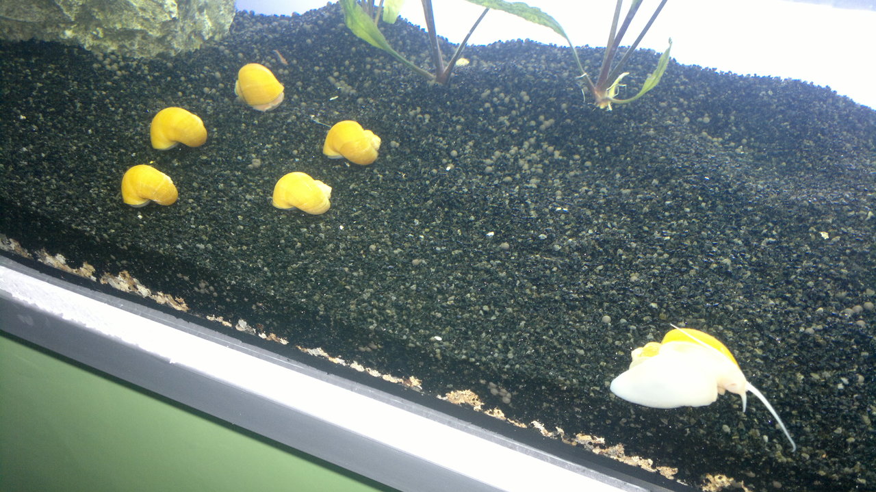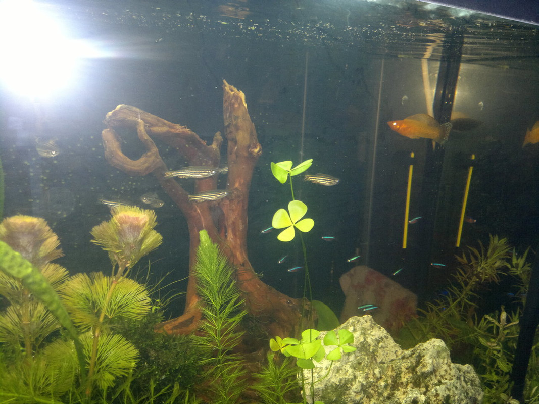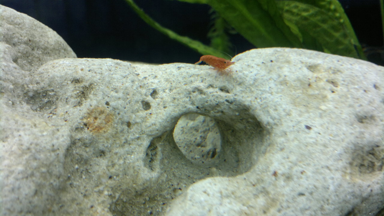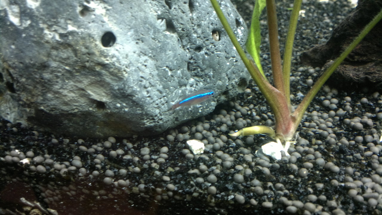 Обитатели: 10 данио-та, 10 сини неонки, цяла банда скариди (red cherry) и 6 охлюва Ампулария.