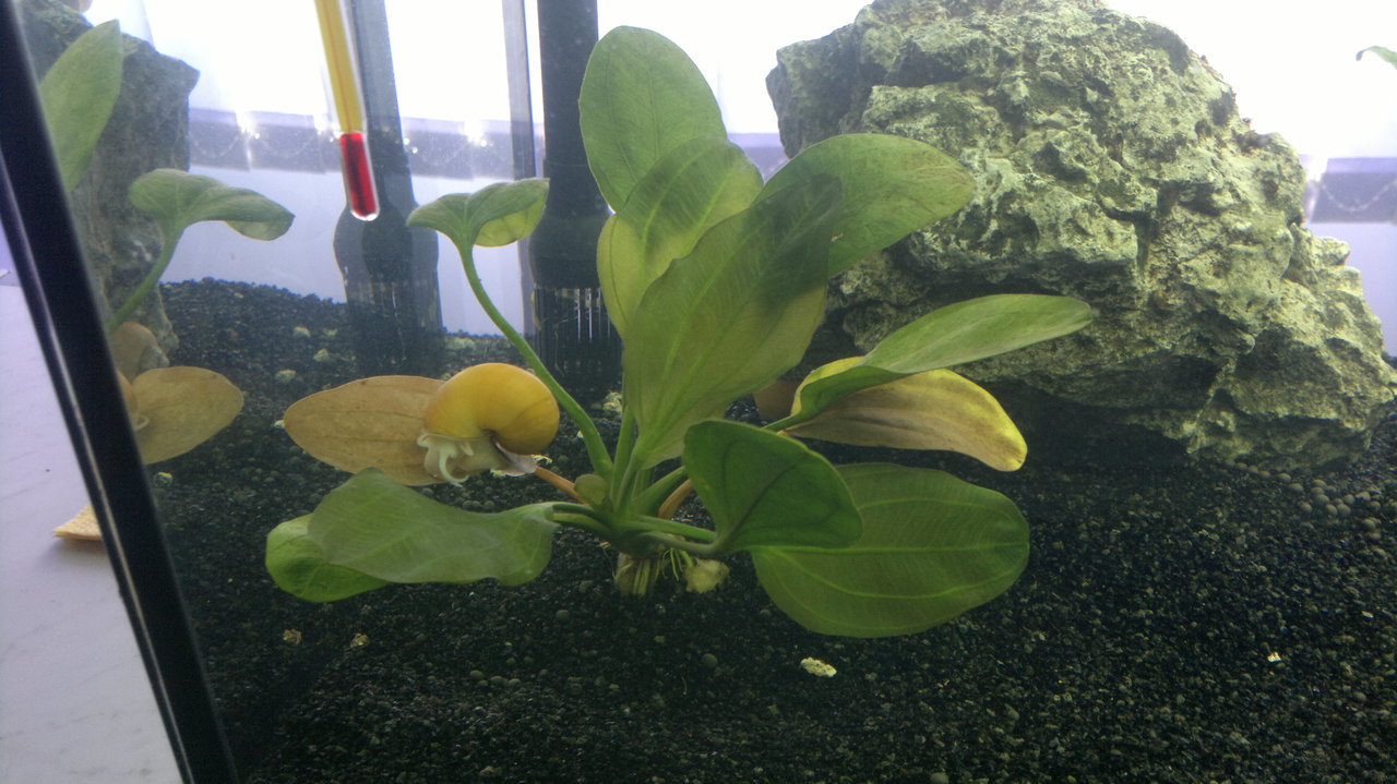 Подвади анубиаса - ризомата му да не е в грунда покрита изцяло. Или го вържи за малко камъче така , че да стои изправен и го остави да си пуска корените в грунда . И като за начало ако мислиш да е там ехинодоруса и няма да го мърдаш слагай подхранка (глинени топчета) вкорените му , че има голяма вероятност да хвърли листата- поне при мен така се получи в нов аквариум преди година почти.