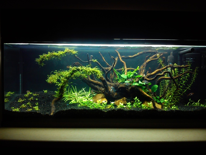 Аквариума е много хубав браво. Анубиасите и корена придават интересен вид, когато пораснат ще стане още по-хубав. На мен първата снимка ми харесва повече водата стои някак си по-тъмна и изглежда повече като в естествената среда на рибките, но това си е мое мнение аз ти предлагам да си го направиш, както на теб ти харесва.  *THUMBS UP*