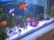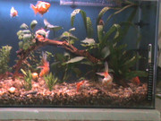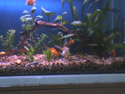 Айде да ви порадвам още малко.Един месец след последния Ъп.Аквариумт още си е 120л,но с много нови обитатели.Естествено пак Златни "прасенца",ей много ме кефят.Ами да не разтягам сега локуми,направо ще пусна снимки.Всичко се вижда,ако на някой нещо не му е ясно да пита. ;-)