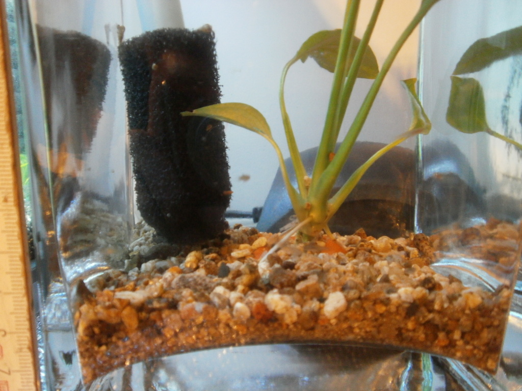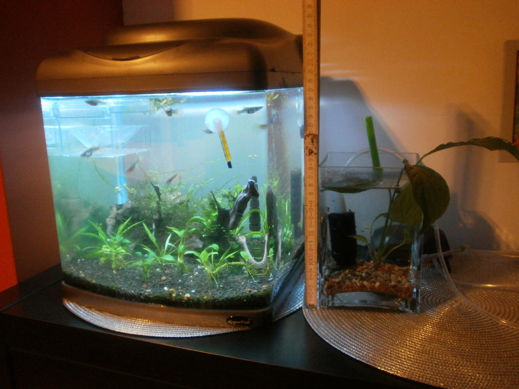 Колеги и аз имам нано аквариум . Първо ми мина през ума да си направя растителен нано в една ваза на жена ми , сложих малко едър пясък , отскубнах една издънка от цвете пак на жена ми *JOKINGLY*. Ползвах керамично кръгче от друго растение, като котва че е много малко пясъка. Така си стоя към 20 дни , и после видях че една от ендлеровите гупи които си купих преди 1-2 седмици ще ражда .Взех да се чудя къде ще държа малките и .... сглобих една малка самодекла гъбка ,въздух от помпичката с тройник с кранче , пуснах наколко охлюва във вазата и ето ти аквариум. Въртя около 2 седмици така , мерих параметрите на водата , два пъти - стабилни .А ето и вазата ,  рибките са вътре от седмица .