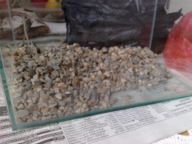 Аз ще ти кажа какво липсва, и корена и пясъка :-) Идеята е ако имаш друг аквариум да преместиш рибките там. За да имаш достатъчно време да си играеш и да връткаш различни подредби. Корен не е нужно да поръчваш. Както и пясъци и тн. Просто помисли къде би могло да има по-едра фракция около вас. Лошото е че не можеш много да шаваш понеже си с децата. Помисли около вас имали детска площадка с пясъчник. Може даже да се получи по добре понеже тези пясъци понякога са жълти. Корен може да се огледаш за някое дърво с по заоблени клонки. Не е нужно да е цял клон просто ти като ги поставиш в аквариума ще ги нагласяш. Но гледай да са по извити за ефект. Искам да кажа, че има начини и без да поръчваш и при малко свободно време когато можеш да измушиш да осъществиш идеята. Помисли добре според мен варианти има и без да цакаш лев. Аз лично за това което направих една стотинка не съм дал. Просто когато съм минавал от някъде все съм забърсвал по нещо. И това не е корен от лоза в смисъл не е корена а горе където си расте гроздето. Поради малкия обем на аквариума някой камъни ги поставях с пинцета. Добре е да се огледаш и за по-големи и дребни по размер. Като подредиш грунда с корена на по ситната фракция се поставят различни по големина камъчета. Това е с цел да предаде по естествен вид. Именно тях аз поставях с пинцета.  :-)
