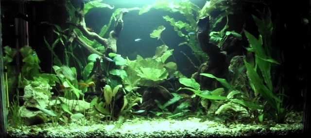 Един месец след старта, никакви проблеми. Всички растения се развиват много добре. Рибките са добре, скалариите растат.:D Не съм сменял никаква вода, два пъти доливах по 2/3 литра. Няма следа от водорасли или друго вредители.