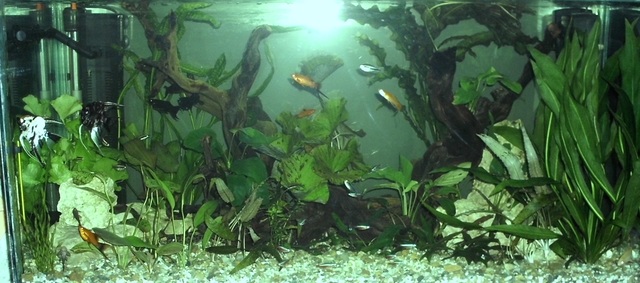 Рибките ще са: 17 бр.неони (червени и черни), чифт скаларий, 4бр. молинезий, 4бр. анциструси, 3бр. коридорас панда (май ще купя още 3/4бр), 1 гибицепс и един платидорас, 2бр. САЕ.