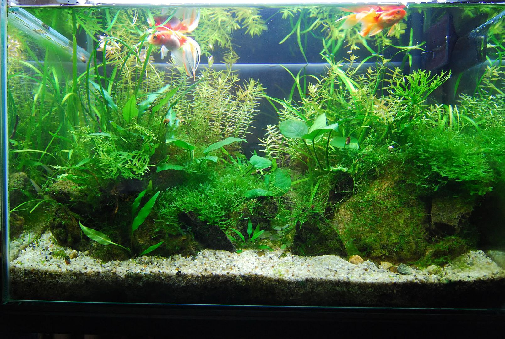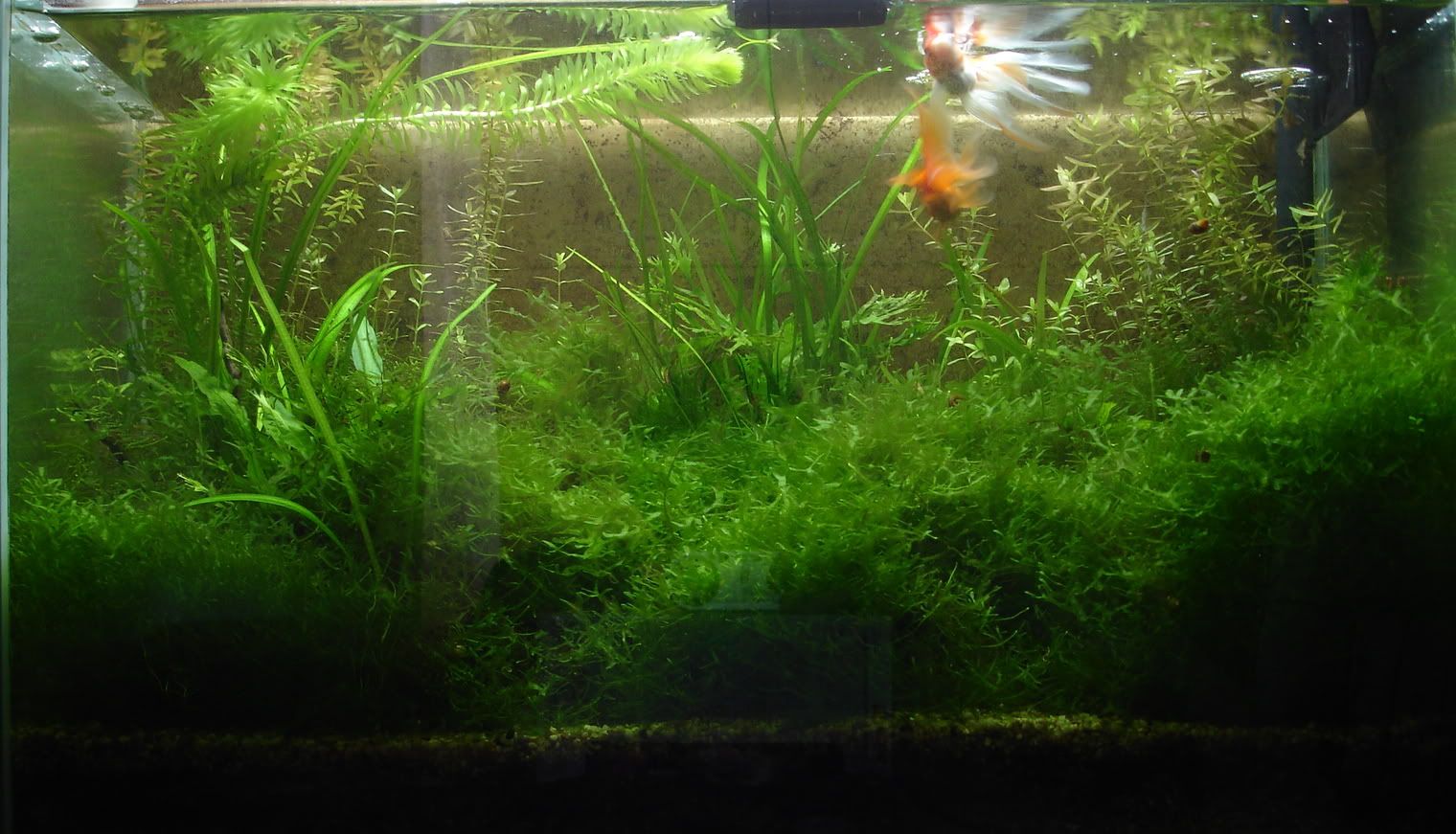 Елеохарисът завладя тотално аквариума, а едната златна почти му стана жертва, беше се оплела в него точно когато отсъствахме за няколко дни и почти беше дала фира. Това наложи да премахна елеохариса и постепенно доби следния вид: