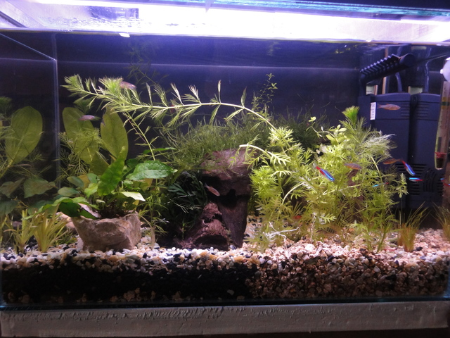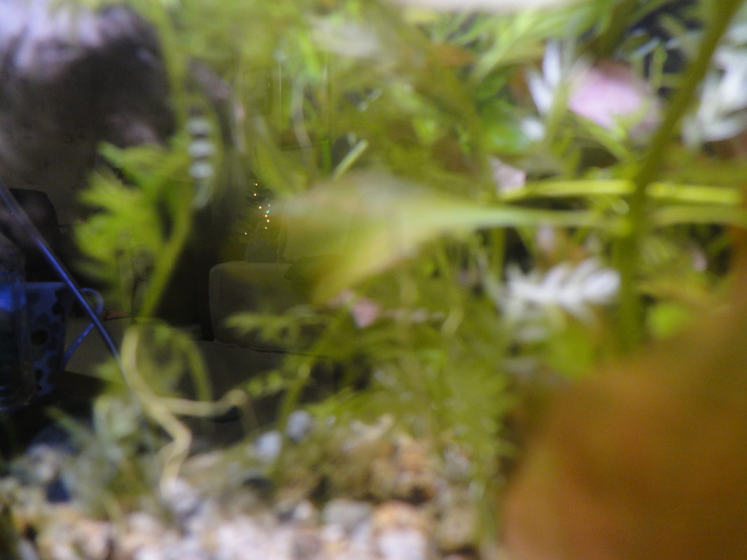 Напоследък бях занемарил този аквариум (но си правих смените на водата), и днес реших малко да го поогледам. По дисплея забелязах малки бели нишки залепени на стъклото. Освен това забелязах множество ситни зелени точки. От 2 седмици, слагах по половин кафе бъркалка тор - акваформула стандарт при седмични смени на водата. От 3-4 дена имам доста растения. Подавам и CO2 с малко нескопосан дифузер - спринцовка с клечки. Осветлението ми е непроменено.