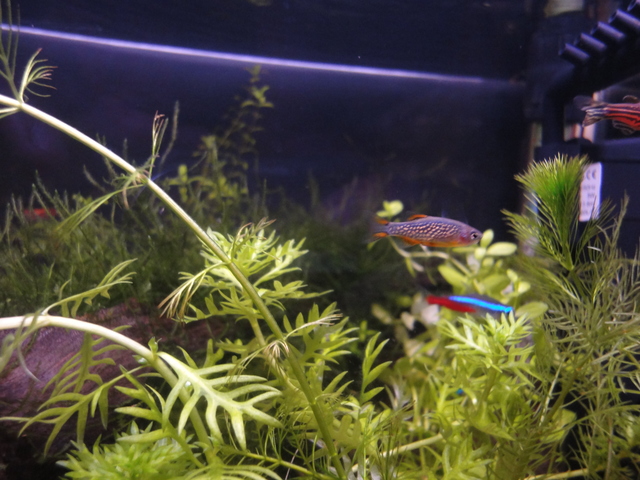 Напоследък бях занемарил този аквариум (но си правих смените на водата), и днес реших малко да го поогледам. По дисплея забелязах малки бели нишки залепени на стъклото. Освен това забелязах множество ситни зелени точки. От 2 седмици, слагах по половин кафе бъркалка тор - акваформула стандарт при седмични смени на водата. От 3-4 дена имам доста растения. Подавам и CO2 с малко нескопосан дифузер - спринцовка с клечки. Осветлението ми е непроменено.