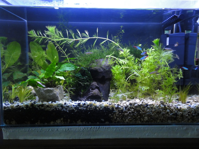 Напоследък бях занемарил този аквариум (но си правих смените на водата), и днес реших малко да го поогледам. По дисплея забелязах малки бели нишки залепени на стъклото. Освен това забелязах множество ситни зелени точки. От 2 седмици, слагах по половин кафе бъркалка тор - акваформула стандарт при седмични смени на водата. От 3-4 дена имам доста растения. Подавам и CO2 с малко нескопосан дифузер - спринцовка с клечки. Осветлението ми е непроменено.