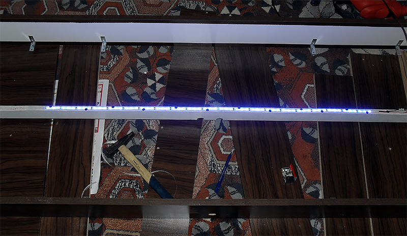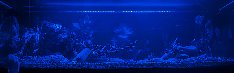 Снимка на аквариума малко след старта. Нощно осветление, което тук се захранва с адаптер на 12V.