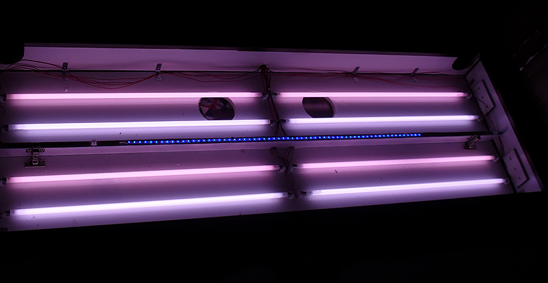 осветление – 4 бр. 39W Aquastar, 4бр. 39W GroLux, 4бр. Tridonic PC 2x39 T5 PRO lp, 8бр. JBL Solar Reflect 80. Нощно осветление - 1м синя LED лента, захранвана в момента от старо зарядно за Nokia.