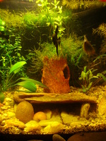 Симпатично е станало, само пещерата малко не ми се връзва, понеже седи изкуствено. Повечето съфорумници биха те посъветвали да махнеш и керамиката. Харесва ми формата на аквариума и съм убедена, че седи страхотно наживо.