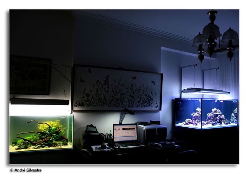 Веднага си личи че е акваскейпър човека, двата аквариума- морския и сладководния акваскейп един до друг са егати гледката =-O