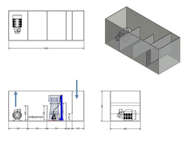 - първо отделение, може и по-тясно (зависи какво ще слагаш там все пак, но за механична филтрация е достатъчно), същото и за отделението на връщащата помпа;