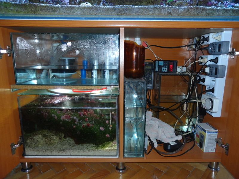 Относно съмпа тъй като няма място,а голям и малък аквариум все изискват много техника,съм го направил с П образна посока на потока.Отзад в ляво е входа,там е и скимера,водата прелива към рефюджиума,а в десния му край се връща към подкачващата помпа.В отделението на помпата има стъклена поставка,на която е монтиран поплавъка,чрез който възстановявам изпарената вода гравитачно от горното 28л аквариумче.В осмозната вода разтварям натриев бикарбонат.Над отделението на помпата са и реакторите с пелети и активен въглен-ако протече нещо случайно да попадне вътре в съмпа,макар че са водозащитени.Потока в тях е чрез малка 1200л/час помпа.Също в отделението на помпата има 2 сензора за ниво,които управляват нивото в последното отделение и защитават помпата от работа на сухо.Когато сменям вода съм максимално улеснен.Сменям за 5 минути-тегля вода от съмпа,помпата сама спира,после с добавянето на прясната вода тя си се включва и подкачва сама.Веднъж на 7-10 дни се налага обаче да махам аквариума с осмозна вода(това става когато се е източил,преди ново зареждане) за да почиствам чашката на скимера,тъй като като се зацапа с нечистотии гърлото и пяната се гаси и силно се влошават качествата на пеноотделянето,иначе между горния съд и съмпа се подава маркуча на скимера за източване на гадостите,когато ме домързи с профилактиката.В дясното отделение на шкафа имам 20л карантинен аквариум и стъклария с 3 отделения за подготвяне на добавките Ca,Kh,Mg,който засега не използвам и чака своята дозираща станция.Диодното осветление е в 4 кръга и имитира добре изгрев и залез.Така постигнах много добър растеж на коралите със икономия на ток в същото време,понеже осветителното тяло е почти 300вата.Голям + за диодите в сравнение с МХЛ лампите,които ползвах.Отделно имам захранване 12v за охлаждане на LED  осветлението,за вентилатора на аспирацията на шкафа и за сензорите за ниво-поплавъците-превантивна мярка срещу трясване от тока,понеже имам навика да бъркам в аквариума,без да изключвам помпите и тоците.Ми това е горе долу.Дано да съм бил полезен по някакъв начин за начинаещите морски акваристи.