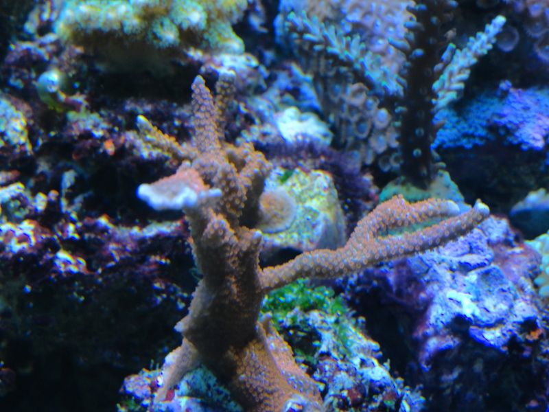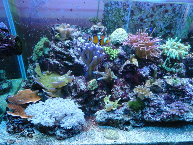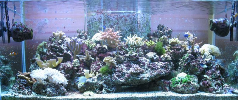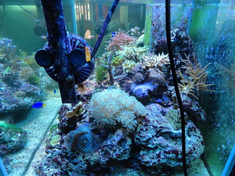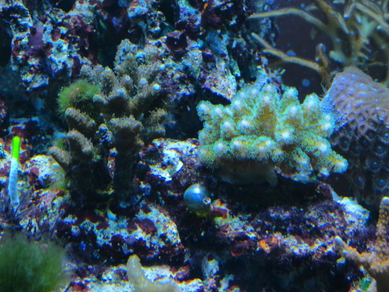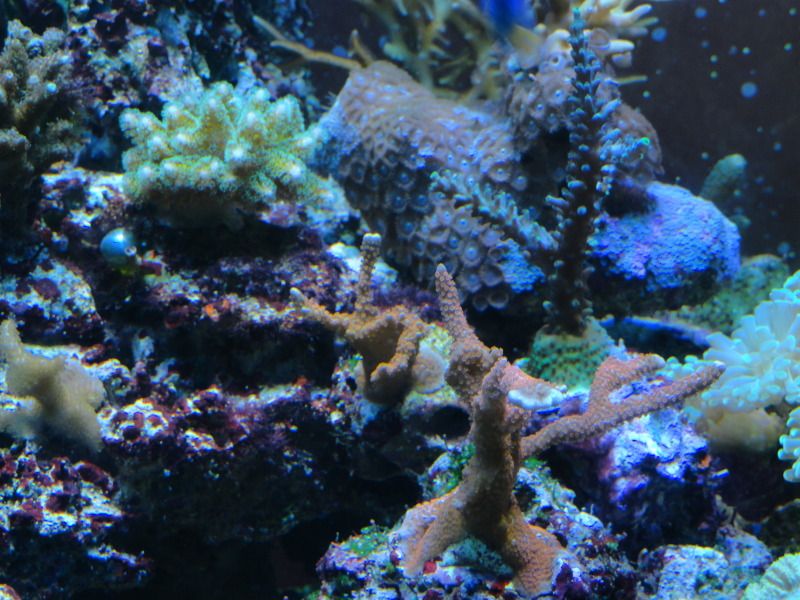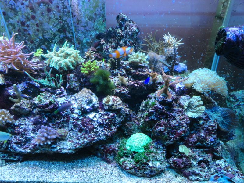 Гледам доста време не съм обновявал,то и сега не беше момента,че много косури си намирам,ноо нека да се види реалността,както каза Октопода-не е образователно да се показваме само когато всичко е наред.Както ще се види на видеото,на определени места има следи от циано все още,което зачезва вече и... алги-червените са устойчиви(макар и да са малко,никога не изчезват),докато зелени имам само по два камъка(фрага) с неизяснен състав.Откак летните месеци предизвиках топлинен шок,впоследствие се появиха циано и нивата на нитрати онзи ден измерих около 5,интересно фосфатите не са мръднали нагоре,пак са си 0. А може нитратите да са от добавения 5г калиев нитрат  :buff: ,с който експериментирах.Поражения нямам никакви от летните горещини,нито от цианото,само един зелен корал малко се обели в основата си и много бавно възстановява фосфоресциращите протеини,но той ми е и от последно закупените и още не се е адаптирал добре.Аквариума е оставен от 2-3 месеца да подивява и да се развива сам.Дъното вече не е така бяло,както беше,но ще го аерирам някой ден.Добавките са полуавтоматизирани-алкалност коригирам с добавената осмозна вода,която компенсира загубите-мога да отсъствам 10 дни без да се налага да се намесвам по някакъв начин,калции добавям 2 пъти в седмицата.Засега нямам нужда от дозиращи помпи,макар скоро да си направя и такъв подарък.Та ето видеото и някоя и друга снимчица:
