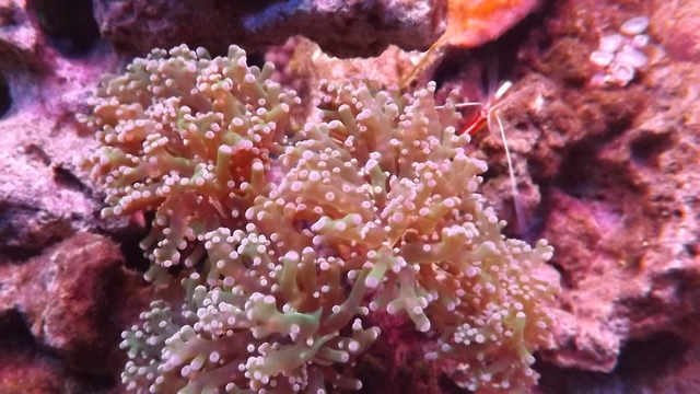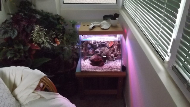Скимер Boyo WG-310, възвратната помпата е китайче 600л/ч като съм и пуснала флейтата по повърхноста на водата, помпа за течение също китайска. Осветлението е диодно (120 диода от тези http://www.ledneonbg.eu/product/269/5050-60-led-m-rgb-dvoyno-vlagozashtitena-mnogotsvetna-lenta-1g-garantsia.html) Във момента сме във фаза...цъфтим и вържем. Идеята е да го направя така че на мен да ми е кеф. Малко бързи снимки със не много добро качество...за напред ще се поправя.