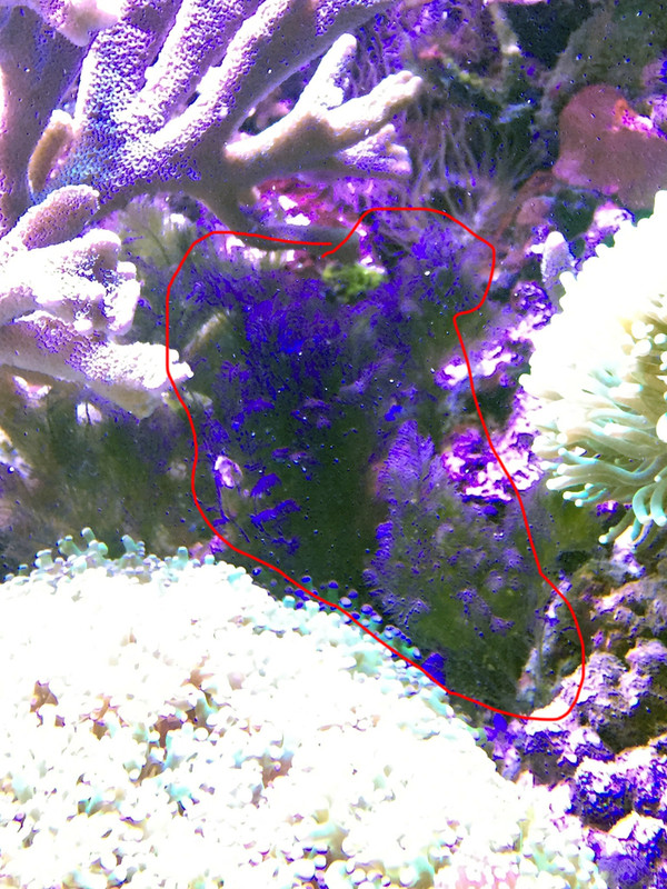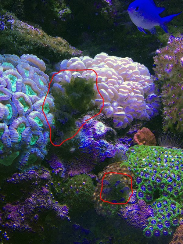 Съжалявам за хубавия риф,но в морската проблемите са разнообразни и неспирни.Хубаво е човек да има карантинен аквариум.По проблема:докато е било малко е можело да го третираш със спринцовка със сода каустик при спряно течение,че гори всичко,до което се докосне.Виждал съм така да горят бабъл алгите.Какво е водораслото не знам,ще трябва да го идентифицираш,за да намериш начин да се бориш.Успех!