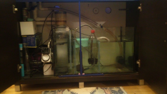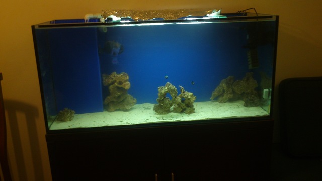 Здравейте новата ситема е готова вече напълнена и пусната във действие трябват да се добавят още много неща камъни във съмпа няма подщи нищо скимера вади много мърсотия осветелението не е готово светя още със старото,използавх водата от сатрия аквариум долях със чиста използвах сол Red Sea ,изчаках 2 часа да се избистри и пуснах рибите.