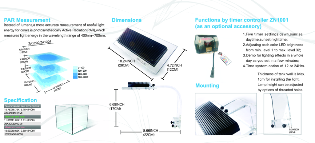 Осветление: Диодно, бели 21бр. 12000К, сини 7бр. 450-465nm, червен 4бр. 620-630nm, зелени 4бр. 520-535nm