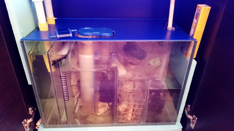 Съмп: Съмпа е устроен по следния начин. Входяща секция, следва вата, после е отделението за скимера с камъни, следва още едно отделение за камъни и медия и накрая помпата.