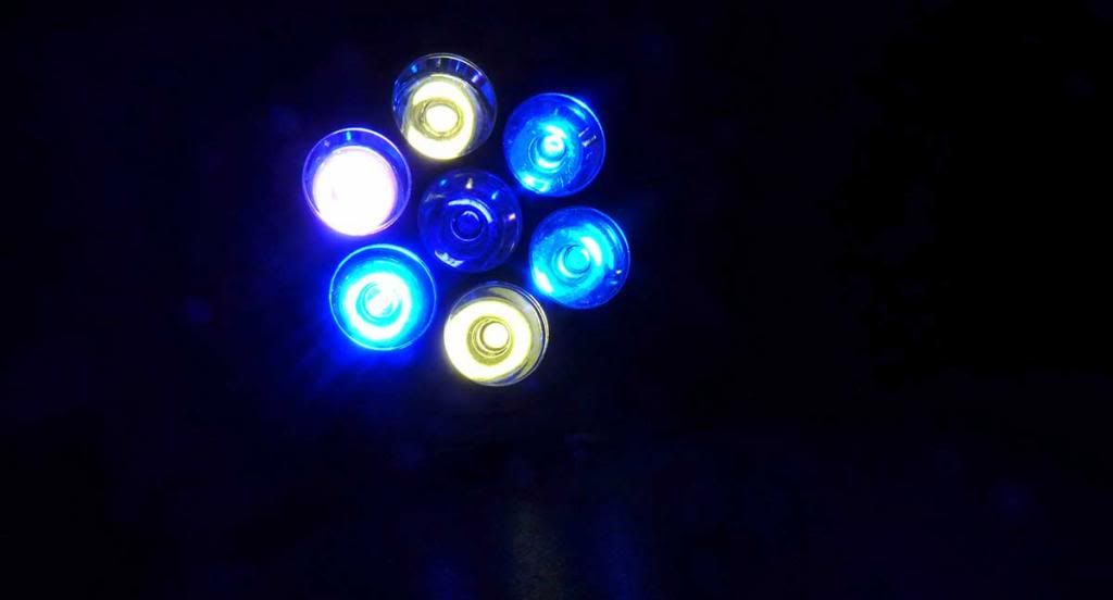 Оставих 2 диода неутрално бяло(оригиналните),а другите 5 бр. ги смених с 1бр. син,1 бр.405nm, 1 бр. 420-430nm и 2 бр. royal blue