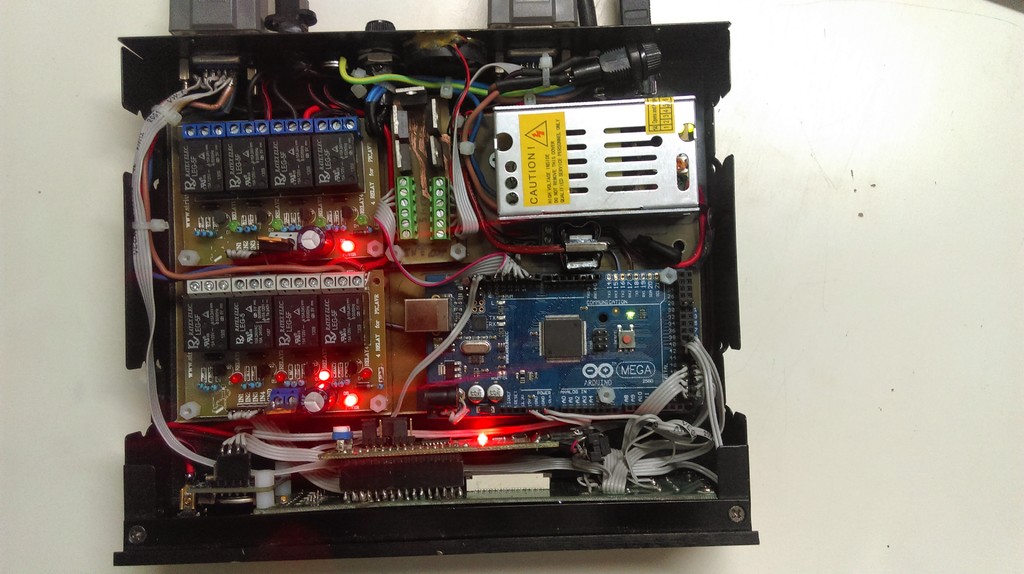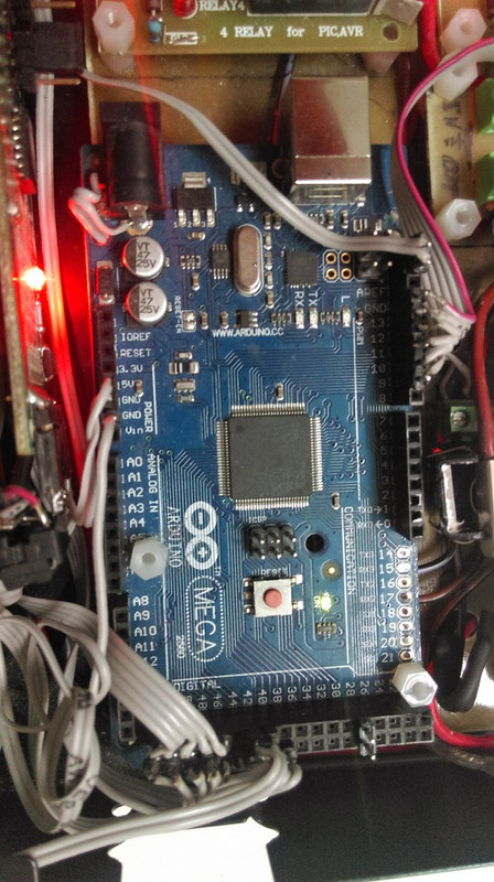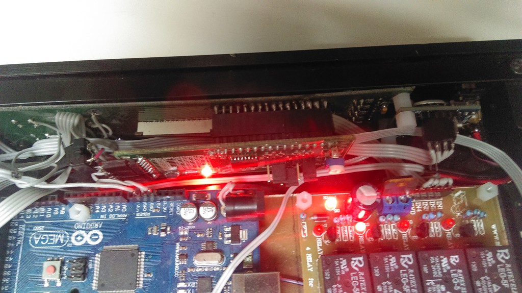 За сега контролера съм го навързал към един нано аквариум... 6 литра :). Аквариума е сладководен, но е само за тестове и поправяне на грешки в кода. Кутията е от безжичен микрофон. Микроконтролера е ATMega2560. Има 8 релейни изхода, 5 с ШИМ(Широчинно Импулсна Модулация) за диодите и комуникационни IIC шини до аквариума и съмпа.