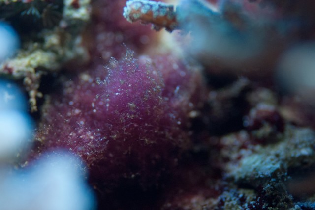 Смени пурите с ATI, вдигни малко осветлението нагоре - примерно 18-20 см над повърхността на водата (вероятно водораслите ти са по горните камъни нали?). Увеличи магнезия в системата - направи го към 1350-1400 постепенно (някои го вдигат още повече с терапевтична цел, но това си е твоя преценка), сега ти е твърде нисък. Вдигни малко кН, направи го постепенно - примерно до около 8. Другото, което вероятно ще ти се стори нелогично, но аз бих вдигнал леко нитратите - не е добре да са пълна нула, да почне теста на салиферт да става леко розов около 0,2 - 0,5 мг/л - просто увеличи мнооого постепенно храненето и следи внимателно нитратите.