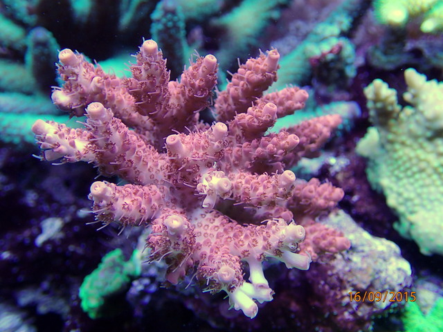 а това е новата ми любимка, не съм я определял още, взех я през юли и вече почти се е удвоила, заедно с прасковената и една зелена милепора са най-бързорастящите корали в аквариума. Камене  *privet*, моля ти се не вкарвай повече акропори, сакън, нямам място ще трябва да разширявам аквариума. BTW знаеш ли кой вид е, че да не се мъча с определянето (едно време ми доставяше удоволствие)