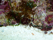 Аквариумът е Cayman 50 на Ferplast. Работи от почти 2 месеца, като съм нагласил таймера да пуска лампата за 3 часа сутрин и 5 часа вечер. Темературата на водата е 24 градуса. Три пъти до сега съм правил тестовете, които ми препоръчаха от магазина (Sera - pH, kH, NO2, NO3 и NH4/NH3) и всичко изглежда нормално, до колкото мога да преценя. Камъните и водораслите ги сложих на втората седмица и от тогава веднъж седмично слагам по няколко милиграма Coralvit C и Coralvit Combi. Занесох малко вода в магазина и ми казаха, че солеността е 1.025.