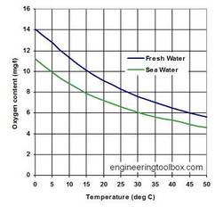 Зависимостта на разтворения кислород в морската вода от температурата е наистина доста силна, но изглежда не е чак толкова критична. Ето тук може да се види каква е зависимостта. (тази графика се отнася за атмосферно налягане при морско ниво и при концентрация на кислород на открито)