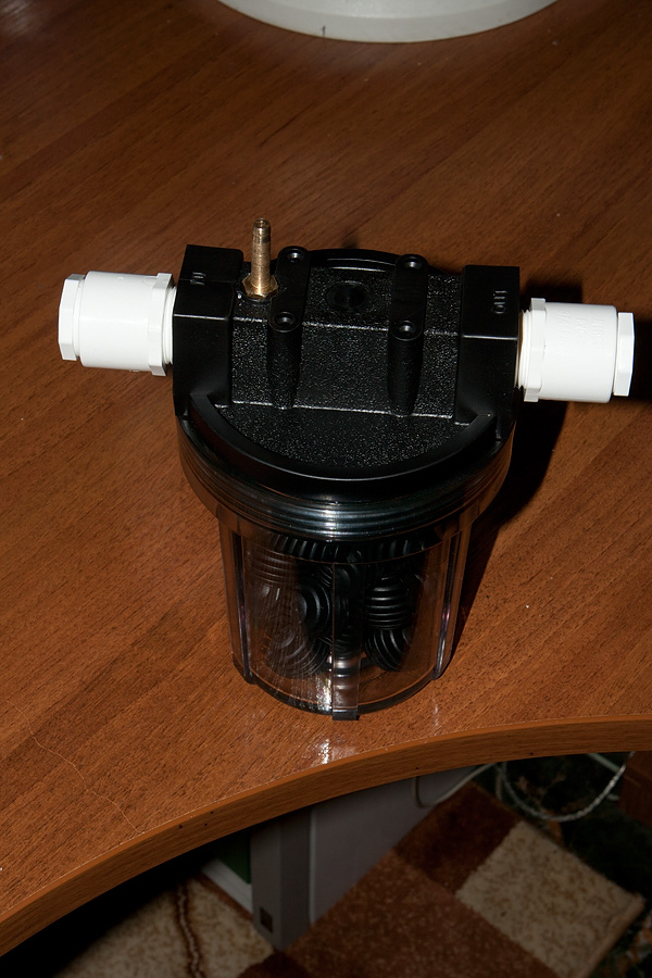 Проблемът е, че фитингите са месингови, а както знаете медта, от която е направен месингът е силно отровна и даже малко количество от нея, разтворено във водата може да навреди на бактериите във филтъра. Затова аз замених вътрешните втулки с пластмасови.