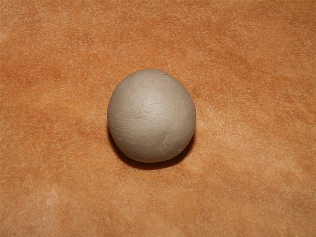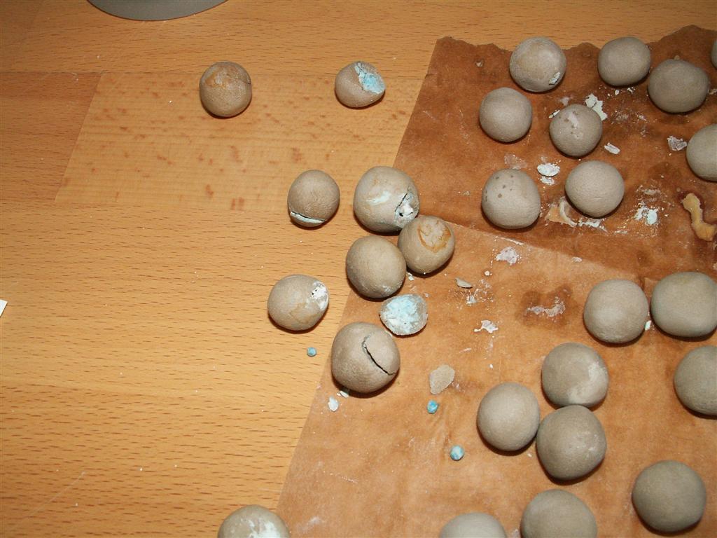 Вземете парче от глината и го оформете до топче с диаметър от 1cm. След това го натиснете с палец, така че да получите шайба, подобна на монета от 1-2 евро. С пръстите си оформете вдлъбнитина в шайбата, така че да заприлича на купичка. Поставете в нея 3-6 зърна от синия тор. След това загърнете торта, така че да не се подава от никъде и оформете отново топче. Оставете го настрана да изсъхне. След най-късно 24 часа топчетата са напълно изсъхнали и готови за употреба.